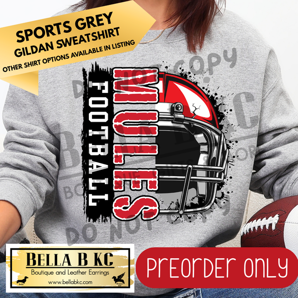 **PREORDER ONLY** Mules (RED) Football Split Helmet - Tee or Sweatshirt - 1 Week Turn Around from Date of Order